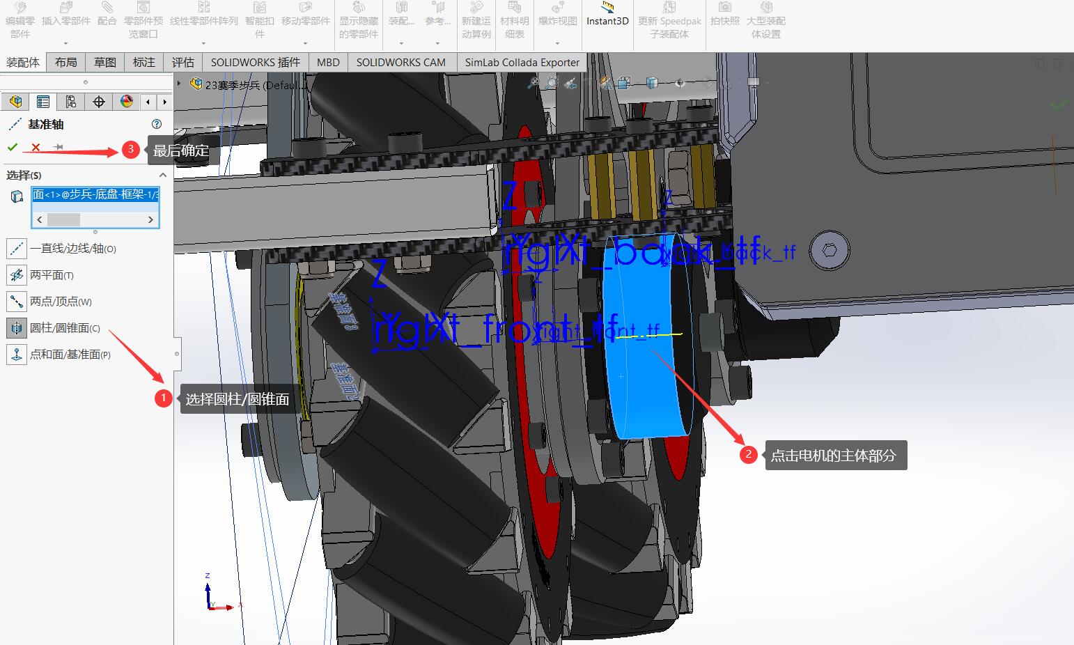 相较于设定坐标轴,这一步会更加简单,通过SolidWorks中旋转轴的设定,即可完成